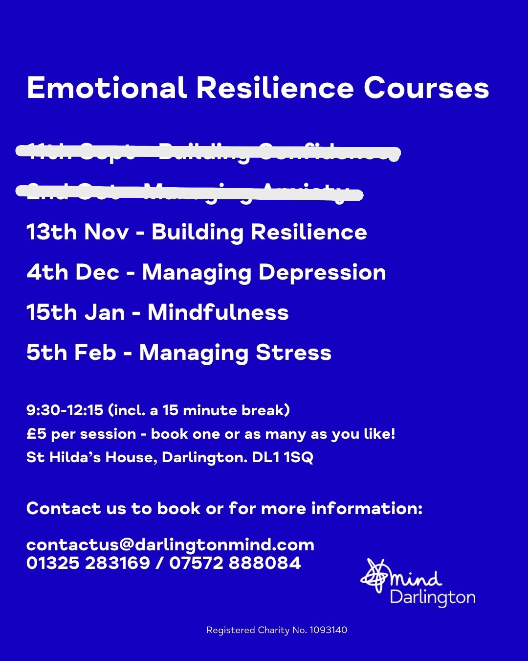 Darlington Mind have a range of courses available weekly - NEW for 2025 - based around Emotional Resilience taking place at St Hilda's House, Darlington. They also host a Women's Wellbeing Hub every Wednesday at the Edge Centre.