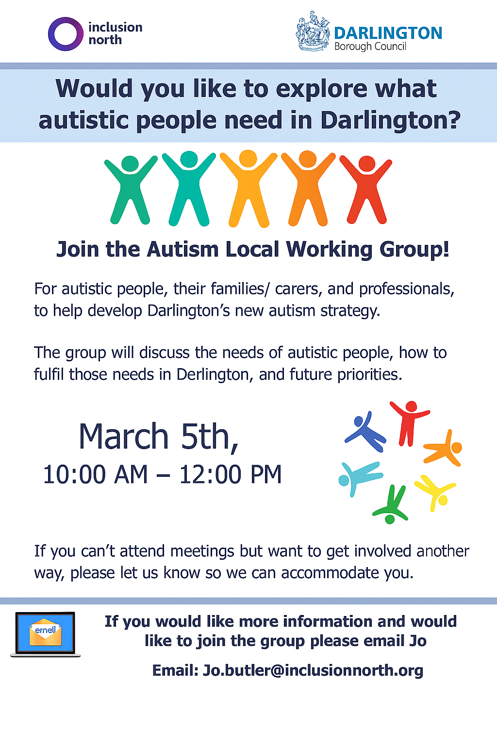 The Autism Local Working Group are looking for autistic people, their families/carers, and professionals to help Darlington's new autism strategy.