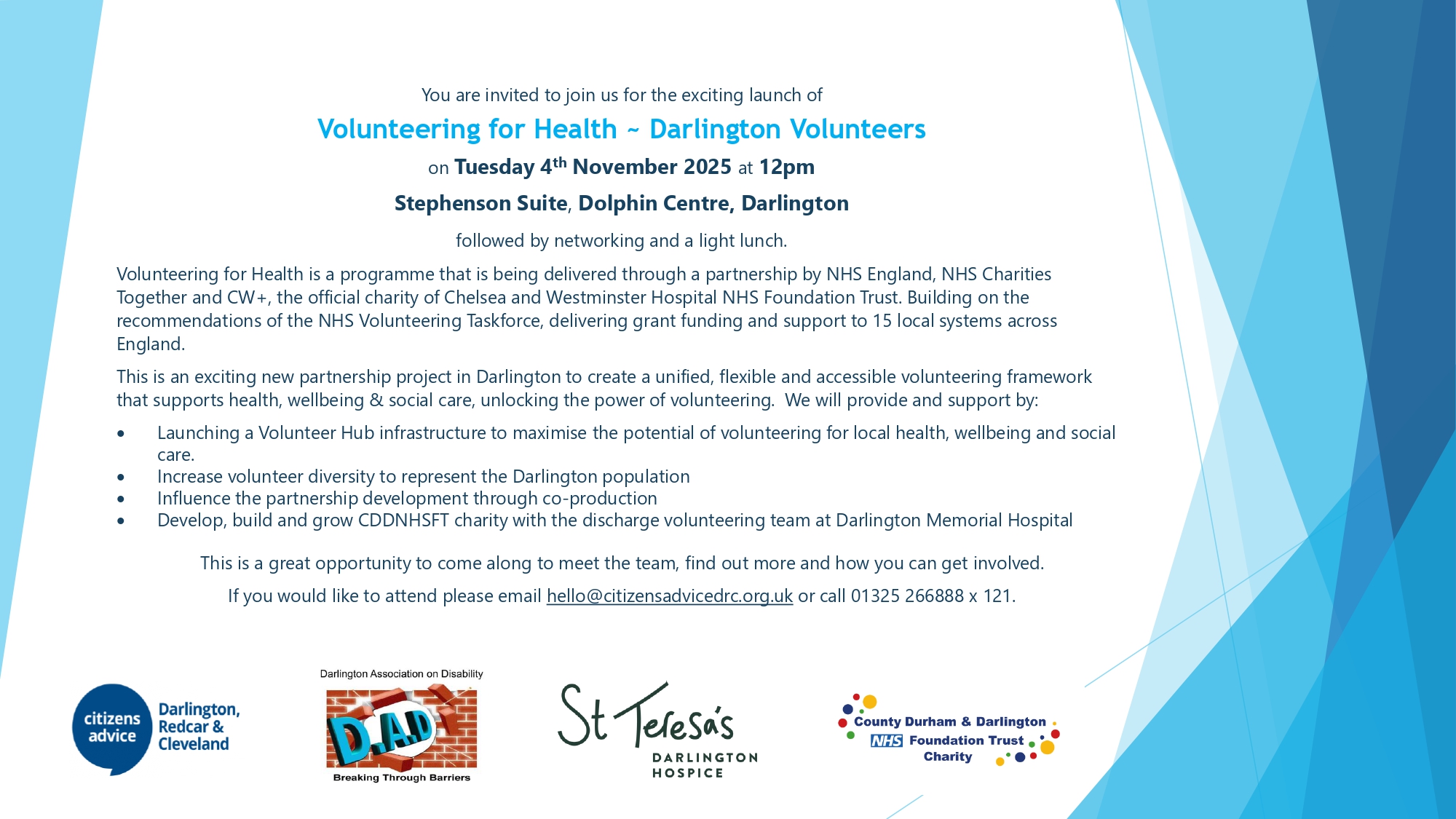 You are invited to join Inclusion North for the exciting launch of Volunteering for Health ~ Darlington Volunteers, on Tuesday 4th November 2025 at 12pm in the Stephenson Suite, Dolphin Centre, Darlington followed by networking and a light lunch.