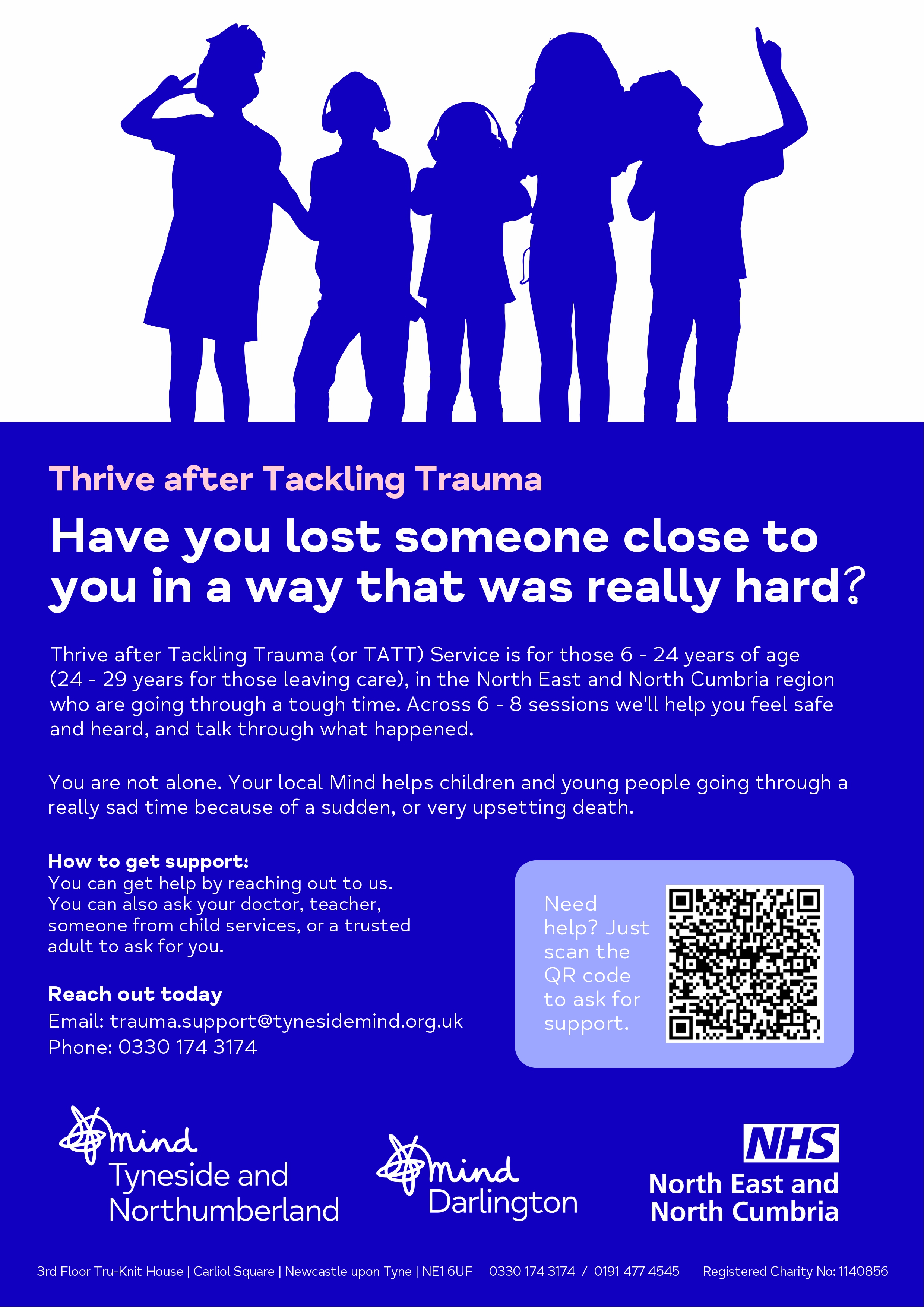 The Thrive after Tackling Trauma (TATT) service is here to support children and young people aged 6 to 24 (up to 29 for those leaving care) right across the North East and North Cumbria region who are struggling after a sudden or deeply upsetting death.