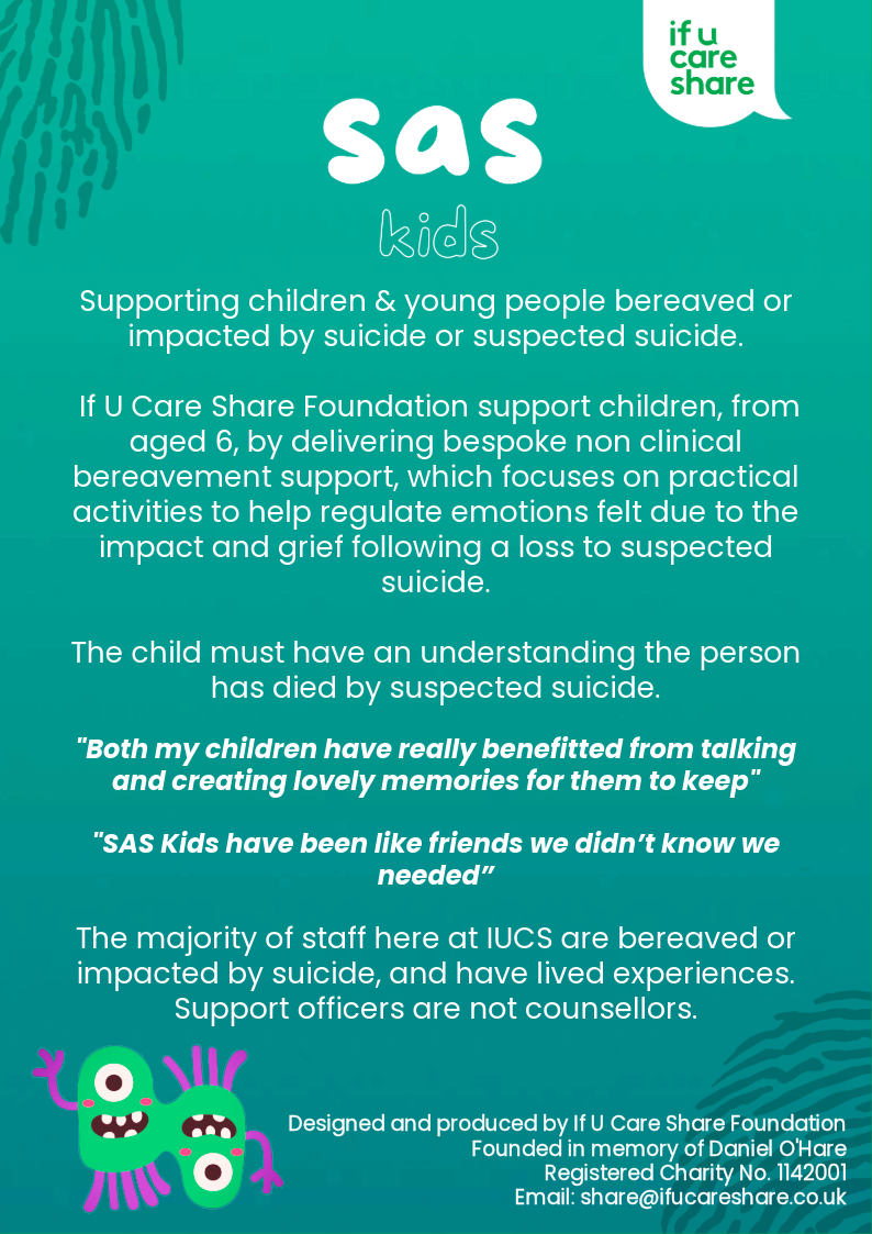 SAS Kids (Suicide Awareness Support) is a heartfelt initiative by the If U Care Share Foundation dedicated to supporting children and young people through one of life’s most difficult experiences.