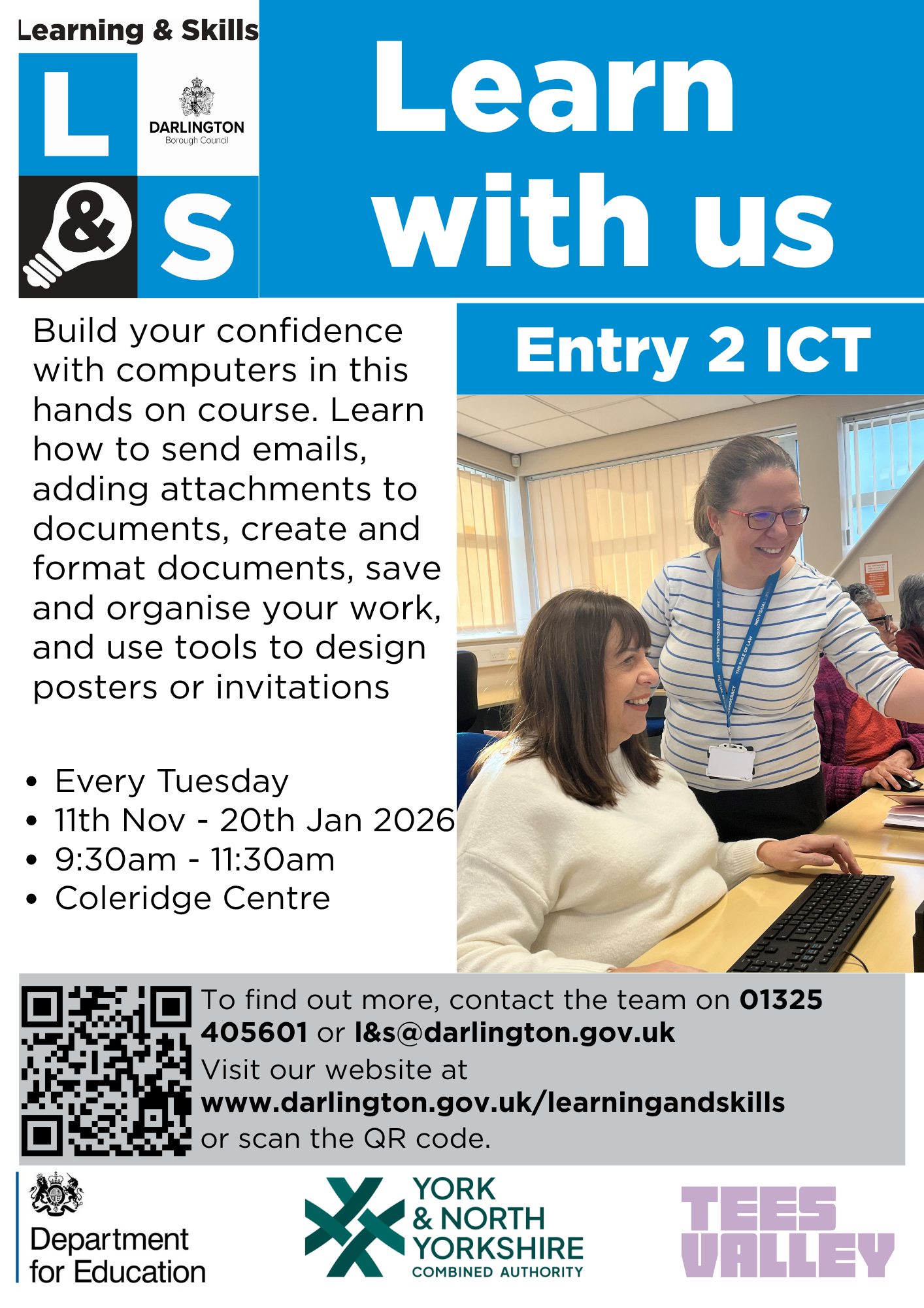 For more information visit www.darlington.gov.uk/learningandskills call 01325 405601 or email l&s@darlington.gov.uk