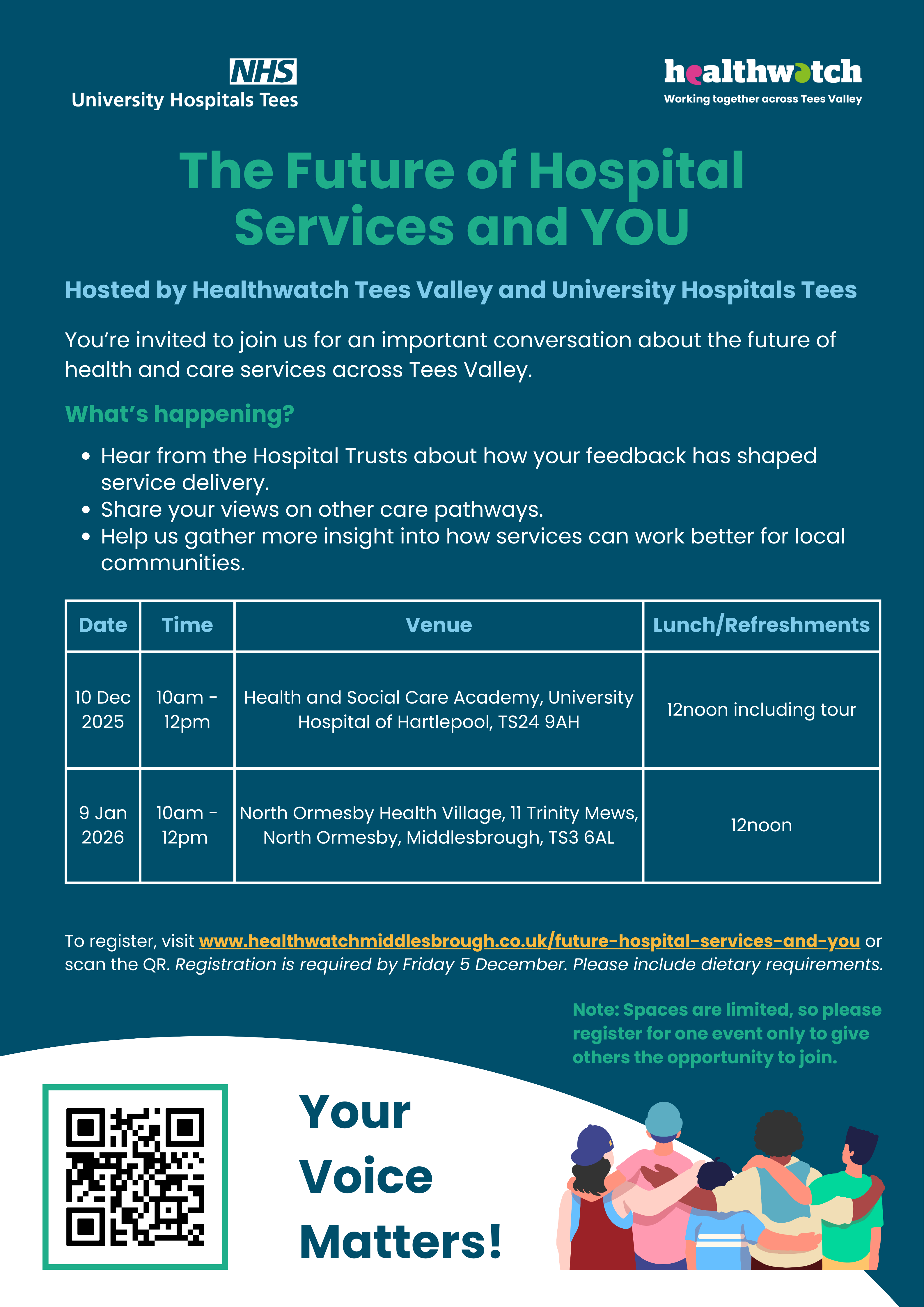 You’re invited to join Healthwatch Tees Valley and The University Hospitals Tees for an important conversation about the future of health and care services across Tees Valley.