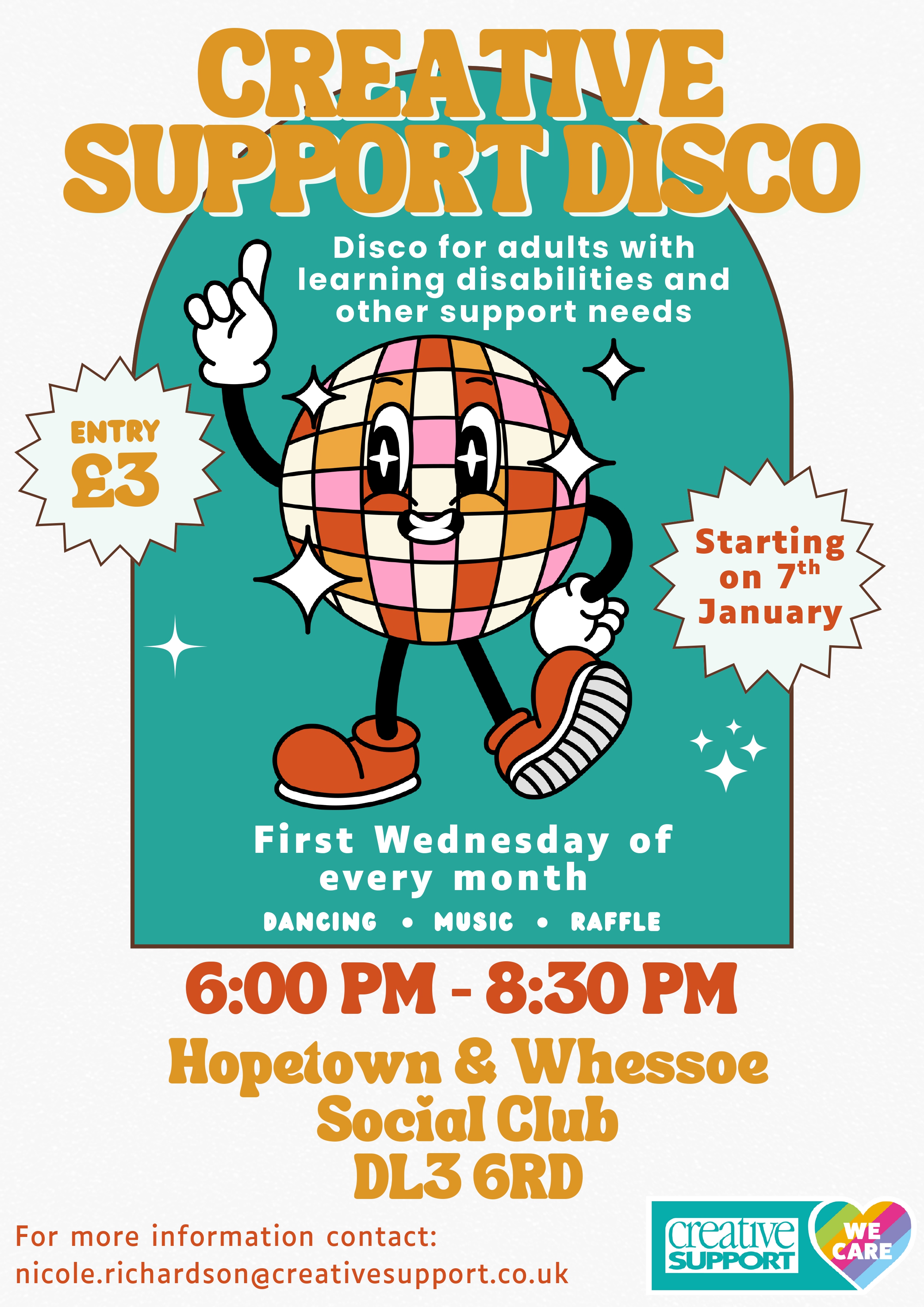 Creative Support is excited to be starting a monthly disco for adults (18+) with learning disabilities at the Hopetown & Whessoe Club in Darlington.