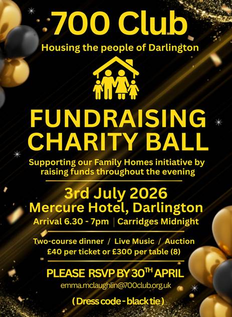 The 700 Club, a local charity dedicated to housing the people of Darlington, is set to host a Fundraising Charity Ball on 3 July 2026 at the Mercure Hotel in Darlington.