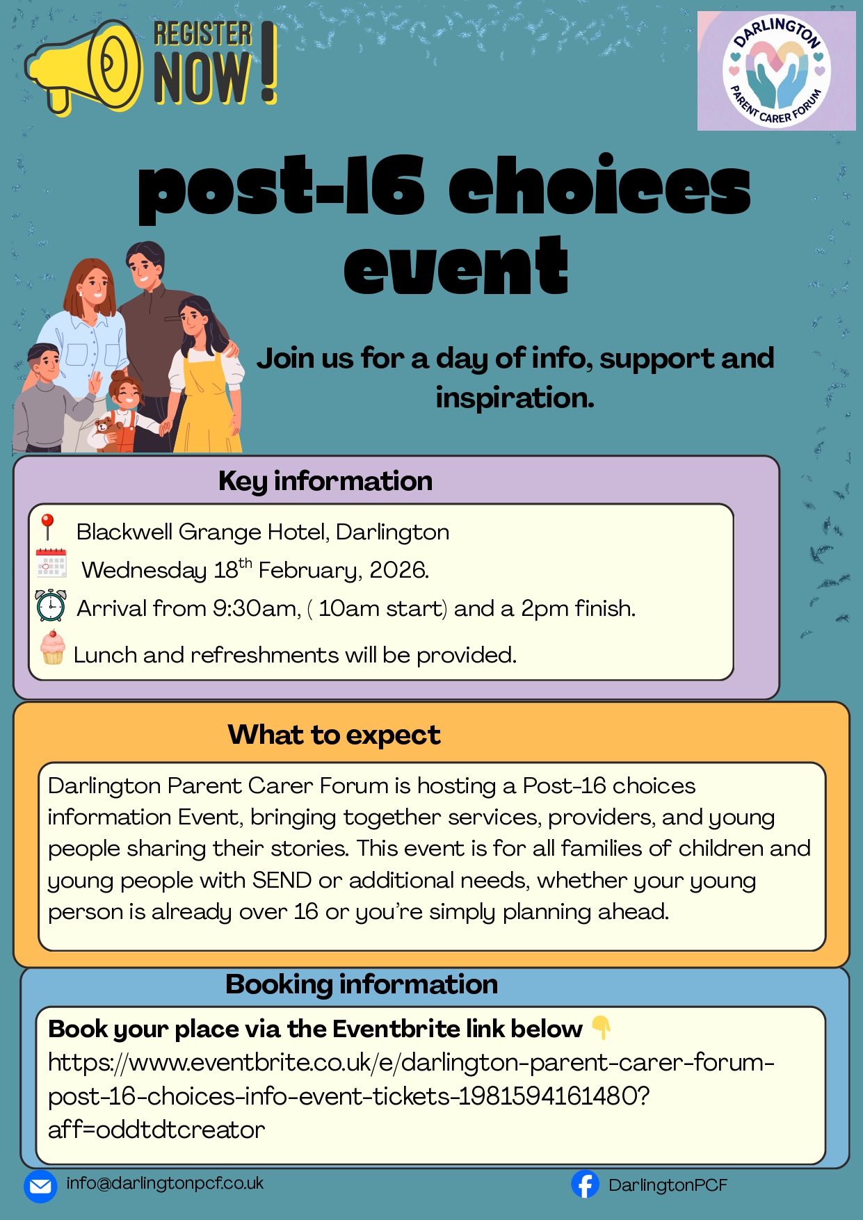 The Parent Carer Forum are hosting a post-16 event at Blackwell Grange Hotel in Darlington on the 18th February.