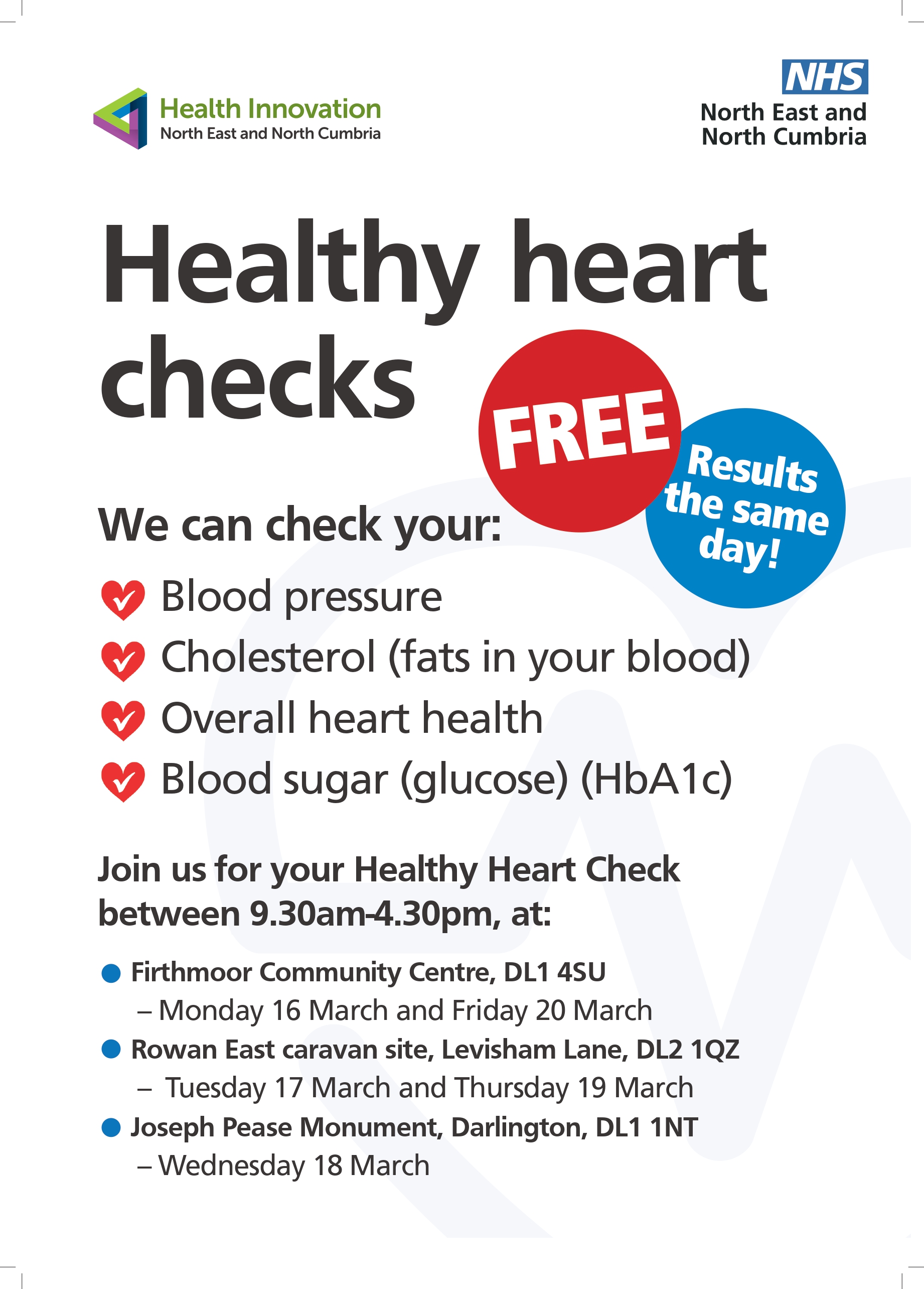 Participants will get their results on the day. The checks help people understand their overall health and, where needed, take early preventative action to reduce the risk of heart attack or stroke.