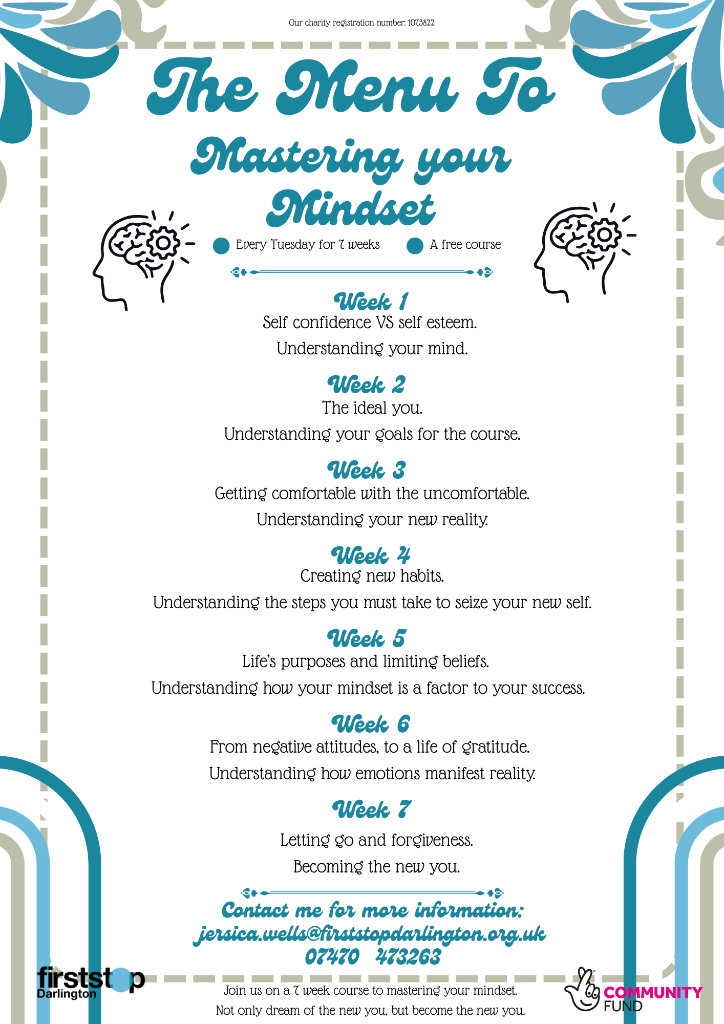 A space on the course must be booked by contacting Jess on 07470473263 or Jessica.wells@firststopdarington.org.uk