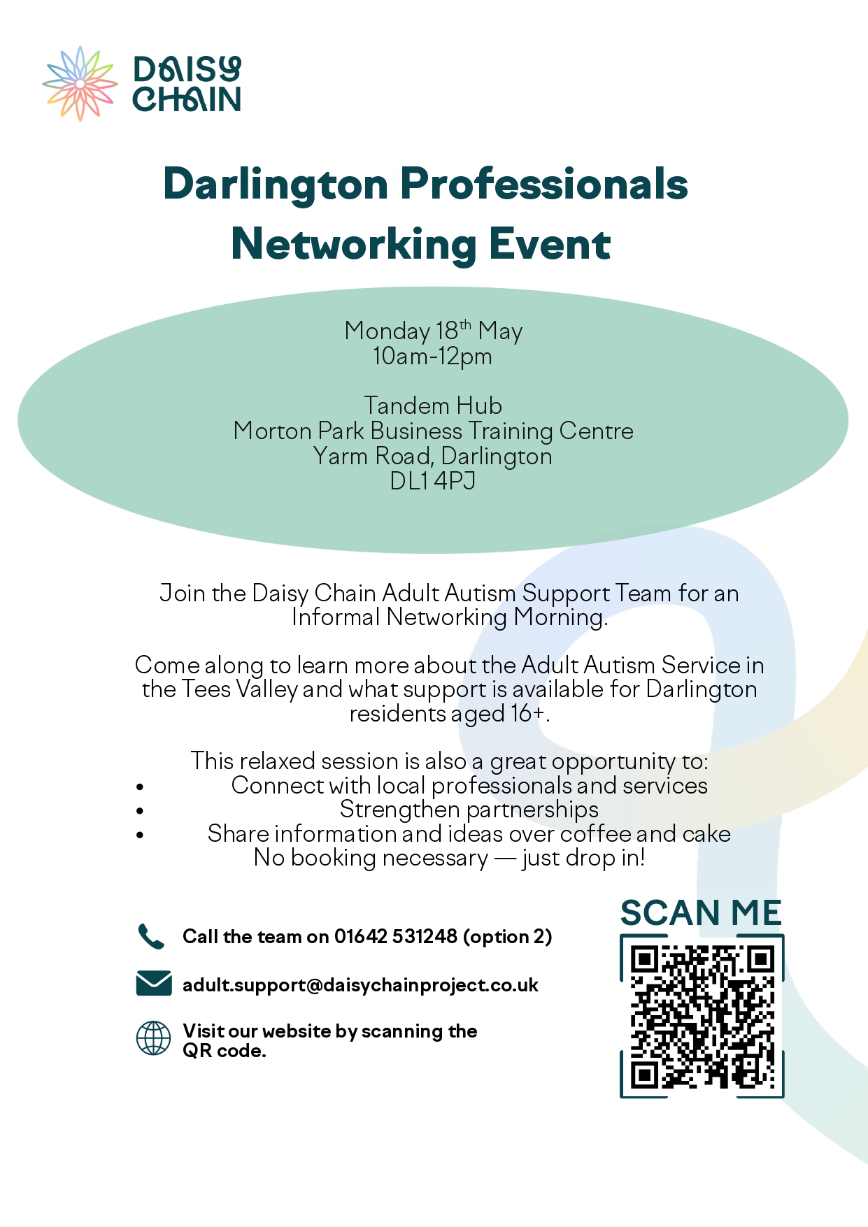 For further information, contact the Adult Autism Support Team at adult.support@daisychainproject.co.uk or call 01642 531248 (option 2).