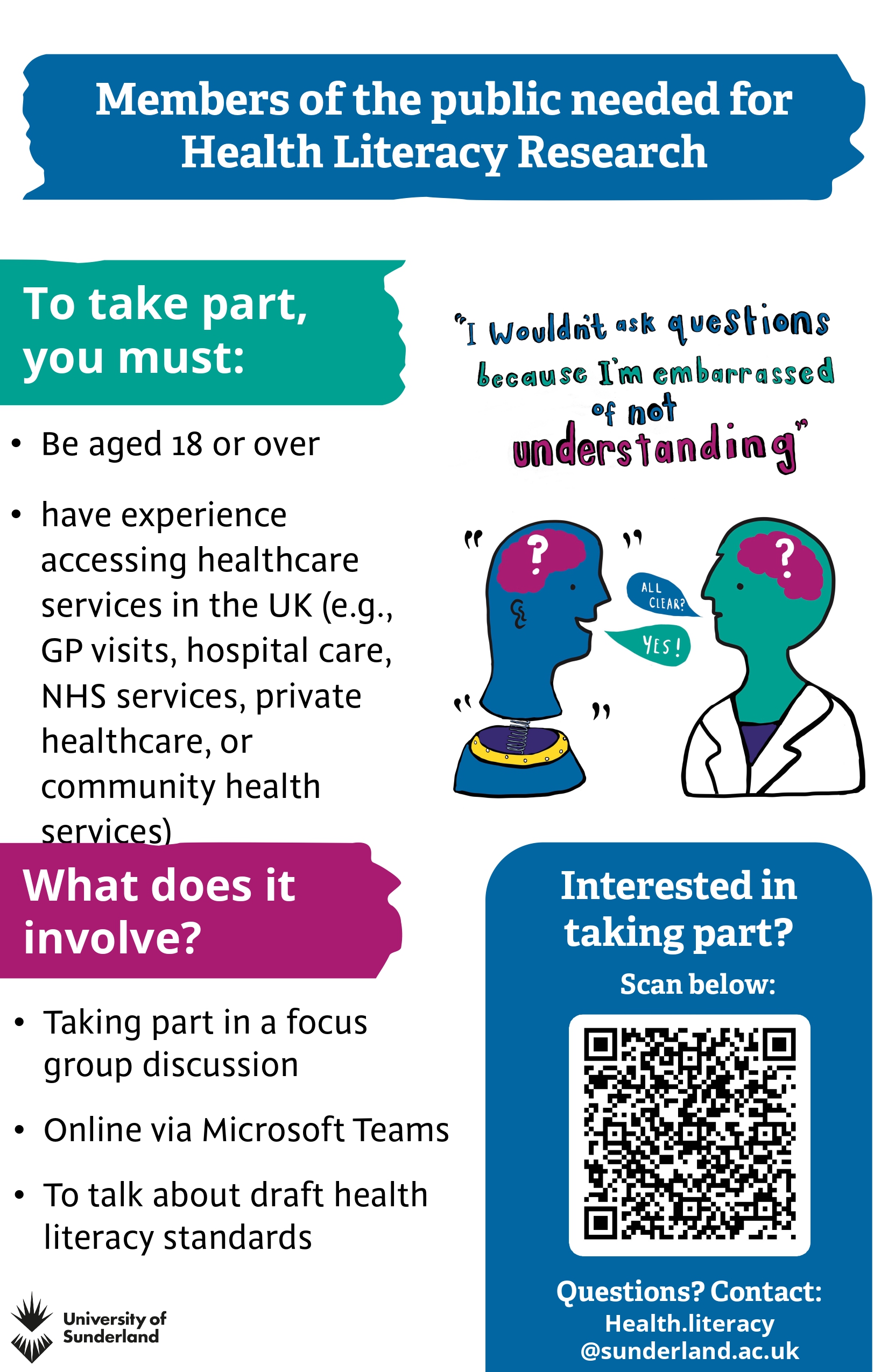 The North East and North Cumbria health literacy team is inviting members of the public to take part in a research study with the University of Sunderland.